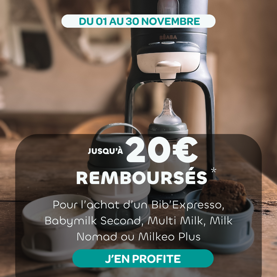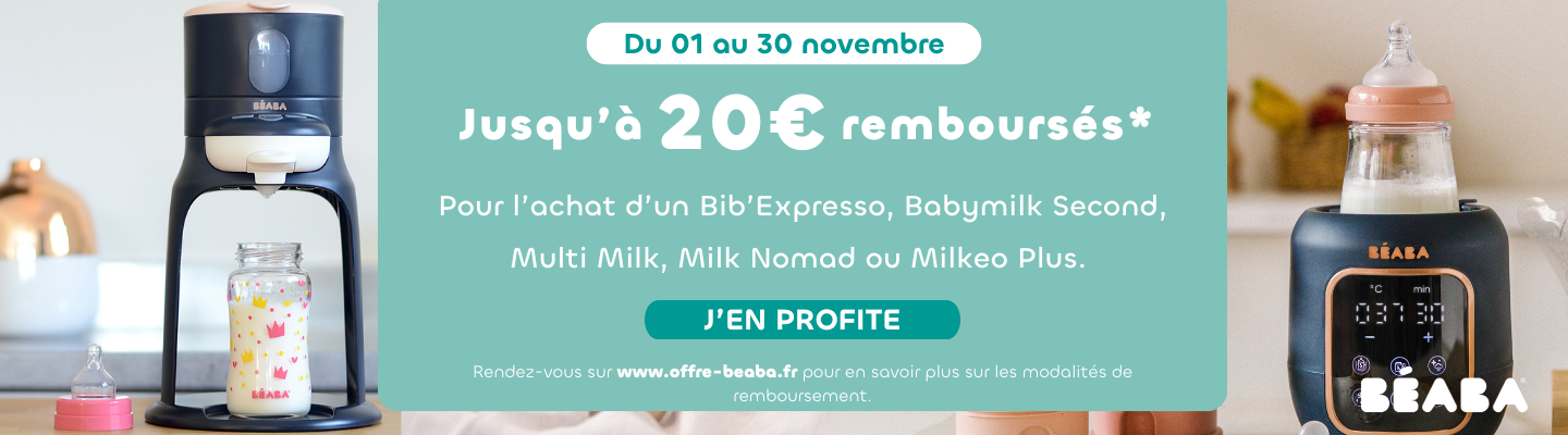 *Offre de remboursement valable pour tout achat effectué durant le mois de novembre sur les articles suivant : Bib'Expresso Night blue, Bib'Expresso White grey, Baby Milk Second, Multi Milk, Multi Milk Argile, Milk Nomad Night Blue et Milkeo Plus. Demande de remboursement à faire sur le site : offre-beaba.com